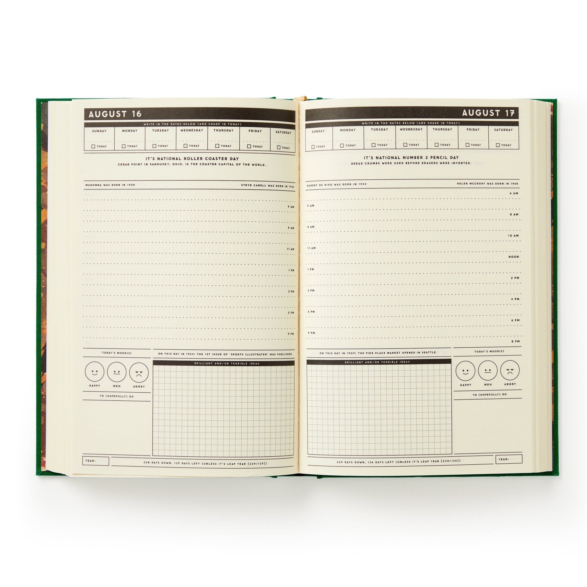 This undated daily planner gives each day a full page. It’s part planner, part journal, part trivia master. We’ve already filled in fixed holidays, celebrity birthdays, and quirky facts—just mark the day of the week and get going.